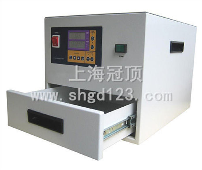 這是一種抽屜式UV固化裝置,廣泛用于模具試驗上光油、手機外殼、光盤、薄膜開關(guān)、電子塑膠外殼UV表面漆涂裝;各種UV涂料、IMD注塑產(chǎn)品油墨固化;用于在固化電子元件、液晶片、端子膠封、手機組件粘合、塑膠組件粘合及LCD等;該裝置體積小,重量輕,制作精良,移動方便,適用于桌面安放。抽屜式UV固化,封閉式設(shè)計避免紫外線直接照射人體,當抽屜完全開啟后可屏蔽大部分UV光安全方便使用;紫外燈照射時間顯示,自動定時功能,可調(diào)(時間繼電器和蜂鳴器)可設(shè)定時間,并且有蜂鳴器報警;紫外線產(chǎn)生的臭氧尾氣可排出室外處理。